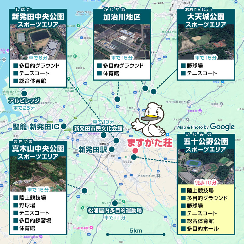 | 特 徴 | 国体会場にも選ばれた本格的な陸上競技場。城下町新発田の歴史を活かした「お城」の様な外観でマラソンゲートは城門、監視台は櫓。全国的にも珍しい風情ある施設です。 |