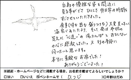 子供が白鳥が見たい!と言って山梨から遥々やって来ました。近くで沢山の鳥を見れて本当に良かったです。色々お気遣いして下さって有難うございました。(HIROさま 男性 山梨県)和牛すきやきプラン