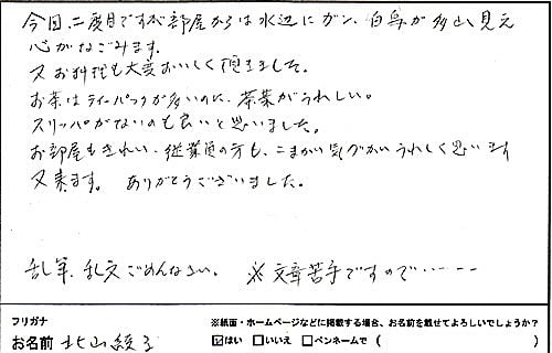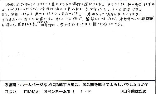 今回インターネットのクチコミを見て、こちらの旅館を選びました。クチコミは私の場合、外れる事が多いのですが、今回は泊まって良かったというお宿でした。とても満足です。また家族・知人を連れて泊まりに来たいです。一度泊まって満足したと言うより、また来たいと思えるお宿です。初の一人旅で緊張していましたが、若女将さんの距離感も程良く感謝します。10年後も変わらぬサービスを続けて欲しいです。