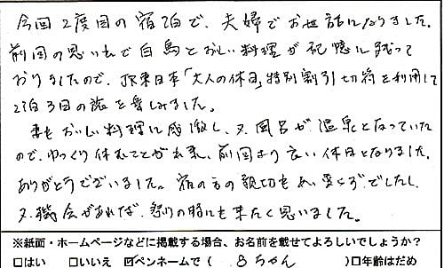単身赴任の主人の為、思い立って近くでゆっくり出来る所と思いインターネットで見つけました。お料理も大変美味しく又皆様の対応も優しくのんびりした時間を過す事が出来ました。(Hさま 女性57歳 新潟県)