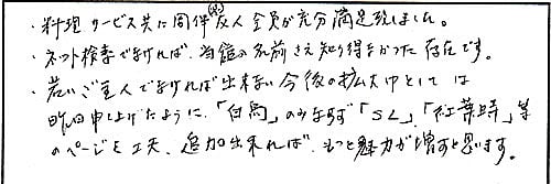 料理・サービス共に同伴友人全員が満足致しました。ネット検索でなければ当館の名前さえ知り得なかった存在です。若いご主人でなければ出来ない今後の拡大策としては、昨日申し上げたように「白鳥」のみならず「SL」「紅葉」などのページを工夫・追加出来れば、もっと魅力が増すと思います。