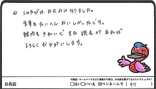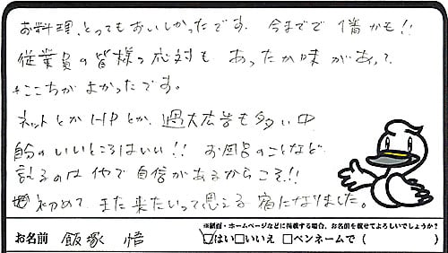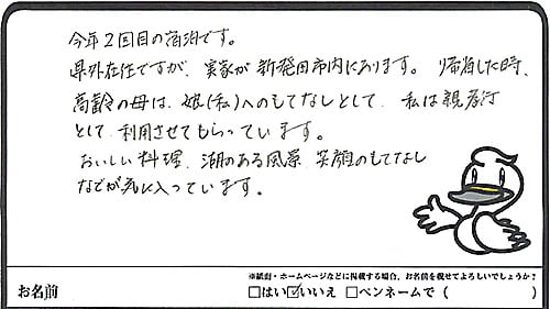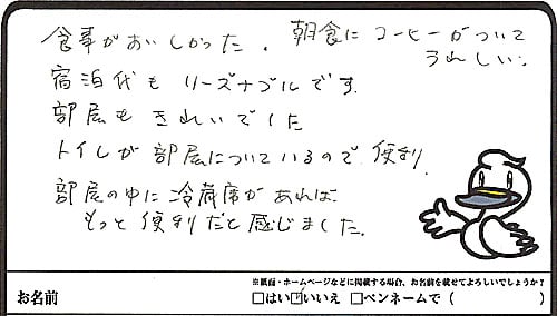 宿の方々のおもてなしも良く快的に過させて頂きありがとうございました。