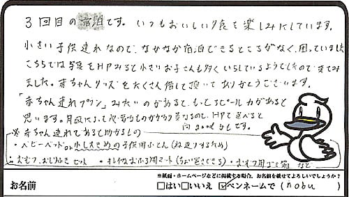 3回目の宿泊です。いつも美味しい夕食を楽しみにしています。小さい子供連れなので、中々宿泊できる所がなく困ってました。こちらはHPで小さいお子さんも多くいらしてるようでしたので来てみました。赤ちゃんグッズを沢山貸して頂き有難うございます。「赤ちゃん連れプラン」みたいのがあると、もっとアピール力があると思います。月齢によって必要なものがかなり異なるので、選べると尚goodかもです。