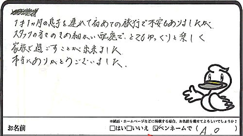 1才1ヵ月の息子を連れて初めての旅行で不安もありましたが、スタッフの方々のきめ細かい配慮で、とてもゆっくりと楽しく家族で過ごすことが出来ました。本当にありがとうございました。