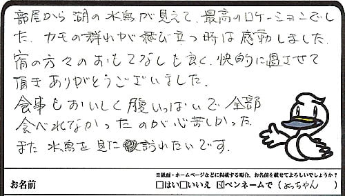 お料理が美味しい。宿の中どこでも清潔。お部屋からの眺めが最高。従業員の皆さんがとても親切。綺麗なお花が飾ってあったりさりげない心遣いがある。子どもへの配慮が感じられる(子供用の枕が用意してあった宿は初めて、朝夕食と異なった器が準備されていて子供が喜んでいた)お風呂のボードのアイデアなど宿泊者への思いやりが表れている。挙げればきりがありませんが、お迎えの時の皆さんの笑顔がとても印象的でこれからお宿で過ごす時間がとても楽しみになりました。期待を裏切らないサービスに皆大満足です。ありがとうございました。次は冬に来たいです。(朝、白い鳥がいましたが白鳥ですか?)(メイとクロクロさま 女性30歳 群馬県)