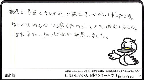 ゆっくり、のんびり過ごせたのでとても満足しました。