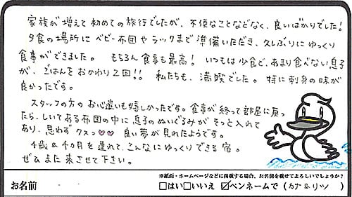 家族が増えて初めての旅行でしたが、不便なことなどなく良いばかりでした! 夕食の場所にベビー布団やラックまで準備いただき、久しぶりにゆっくり食事ができました。もちろん食事も最高! いつもは少食で、あまり食べない息子が、ご飯をおかわり2回!! 私たちも満喫でした。特に刺身の味が良かったです。スタッフの方のお心遣いも嬉しかったです。食事が終わって部屋に戻ったら、敷しいてある布団の中に息子のぬいぐるみがそっと入れてあり、思わずクスっ♡良い夢が見れたようです。4歳&4ヵ月を連れてこんなにゆっくりできる宿。ぜひまた来させて下さい。