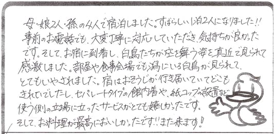 母・娘2人・孫の4人で宿泊、素晴らしい1泊2日になりました! 事前のお電話でも大変丁寧に対応して頂き気持ち良かったです。お宿に到着し、白鳥達が空を舞う姿を真近で見られて感激。部屋や食事会場でも潟にいる白鳥が見られて、とても癒されました。お掃除が行き届きどこも綺麗で、セパレートタイプの館内着や紙コップの設置など、使う側の立場に立ったサービスがとても嬉しかったです。そして、お料理が最高に美味しかったです! また来ます!(欄外記載:スタッフの方もみんな笑顔で丁寧に対応して下さり、気持ち良かったです。夕食の「いぶりがっこ?」のようなお漬物が美味しかった♡)【女性|SIさま】