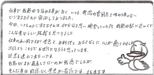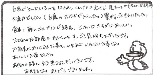 大変すてきな時間が過ごせました。部屋はとても清潔で、アイロンまで用意されてたので助かりました。料理も心のこもった料理でした。とても美味しかったです。ご馳走様でした。あと朝白鳥の飛び立つところは、初めて見たので感動しました。こちらの旅館に泊まって本当に良かったです。お世話になりました。【新潟県燕市|ナミナミさま】