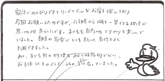 家族でのんびりできてリーズナブルなお宿を探しており今回お願いしたのですが、お部屋から湖を一望できる環境が思いの他良かったです。子供も白鳥へのエサやりを楽しんでいました。部屋の家電がとても新しく気持ちよく利用できました。あと、子ども用の料理もあまり族館的でないお子様ライスのようで、うちの子には合っていました。【女性|MNさま】