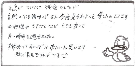 白鳥が少なくて残念でしたが、自然の生き物なのでまた今度見られるのを楽しみにしてます。お料理やもてなしなどとても良くて、良い時間を過ごせました。機会があれば又来たいと思います。元気で長生できればです(^^)【群馬県吉岡町|大澤 強さま】