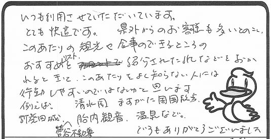 いつも利用させて頂いています。とても快適です。県外からのお客様も多いとのこと。この辺りの観光や食事の出来る所のおすすめリストで紹介された紙などを置かれると、この辺りをよく知らない人には行動し易いのではないかと思います。例えば、清水園、ますがた周囲散歩、新発田城、菅谷不動尊、胎内観音、温泉など。どうもありがとうございました。
