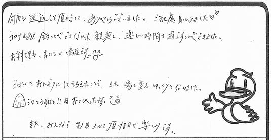何度も送迎して頂きまして、ありがとうございました。ご配慮助かりました。コロナもあり、会うことができなかった親戚と、楽しい時間を過ごすことが出来ました。お料理も美味しく満足です(^o^)ご飯をおにぎりにしてもらえたことで、また場を変えゆっくりと過ごせました。ゴマと梅干しのおにぎり!美味しかったです(^o^)また、みんなで利用させて頂けるのが楽しみです。