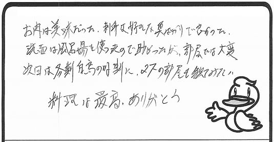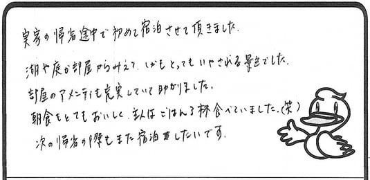 ビジネスで利用しました。お世話になり、有難うございました。料理のクオリティ、過ごし易さ、布団のふかふかさ、これでこの価格は安いくらいです。最近の地方出張では大手ビジネスホテルチェーンが無く、寝心地の悪さやベッドマットのクオリティの低さに困っていました。この宿との差が際立つ結果となり、より満足度が上がっています。このような宿が、これからも元気で、永く続いていくことを祈っております。ちなみに私のようなビジネスマンは、宿泊費の大半は)会社持ちです。素晴らしい料理があるので追加のお酒やプランなど、食時中に営業されても良いと思いました(笑)【男性|平山さま】