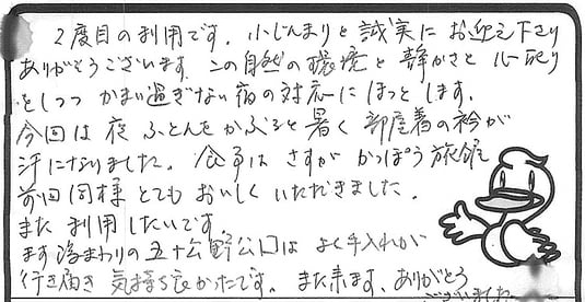 2度目の利用です。小じんまりと誠実にお迎え下さり有難うございます。この自然の環境と静かさと心配りをしつつ、かまい過ぎない宿の対応にほっとします。今回は夜ふとんをかぶると暑く、部屋着の衿が汗になりました。食事はさすが割烹旅館、前回同様とても美味しく頂きました。また利用したいです。ます潟周りの五十公野公園はよく手入れが行き届き気持ち良かったです。また来ます。ありがとうございました。